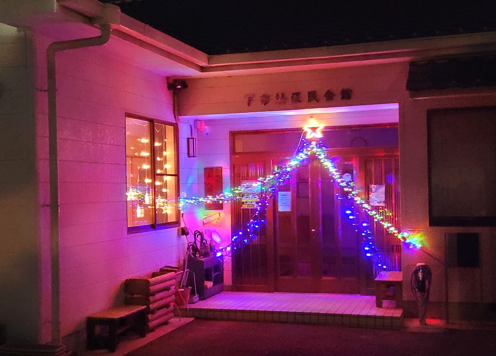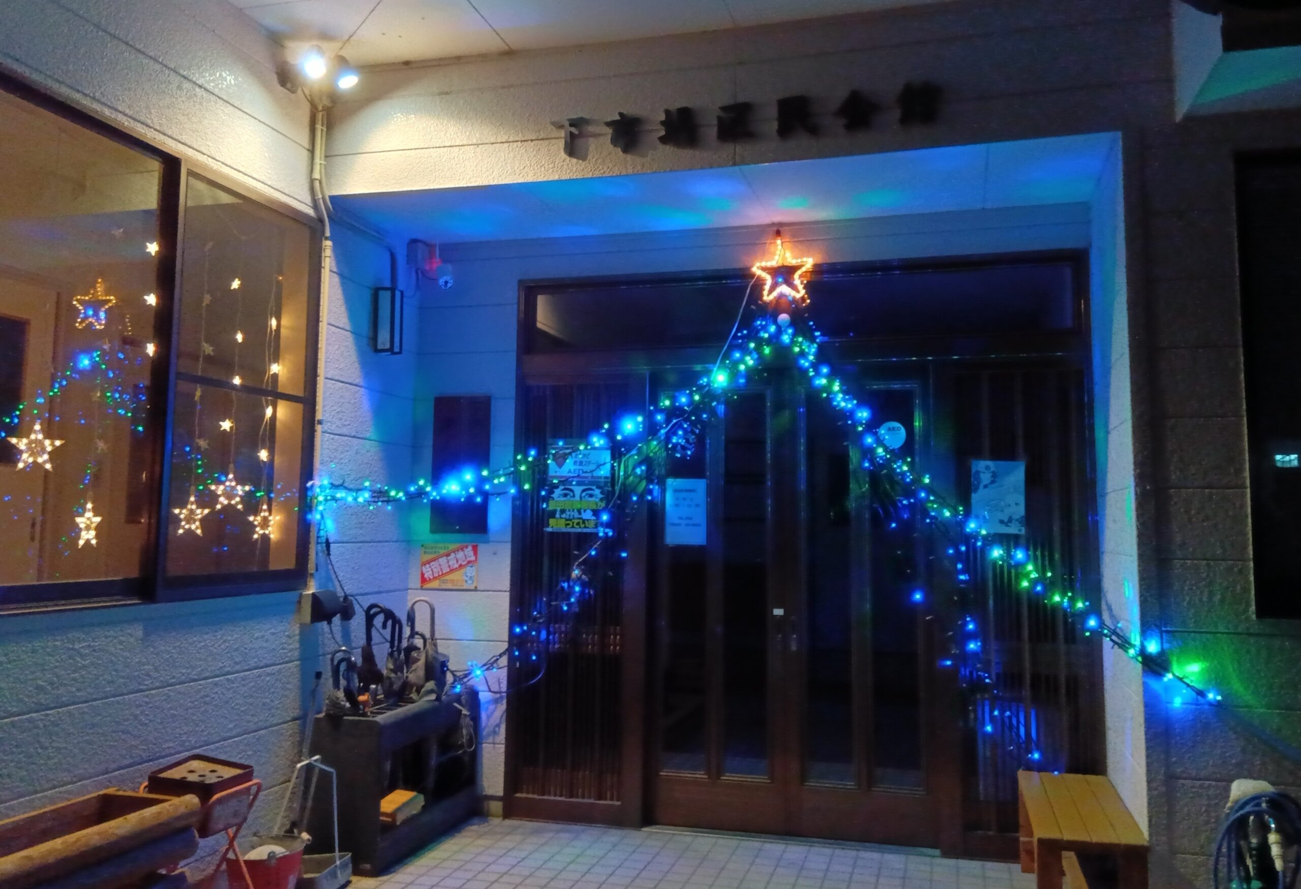 12月は、あちらこちらで「クリスマスイルミネーション」が夜空を照らします。近くでは、朝日丘コミュニティー会議の委員(下市場自治区からも参加)が朝日丘芝生広場に設置した「イルミネーション in 朝日丘」が有名です。下市場自治区においては、玄関を彩る程度のものですがデコレーションしました。瞬く虹色と青色の光が辺りを優しく包みます。是非、一度ご鑑賞ください。